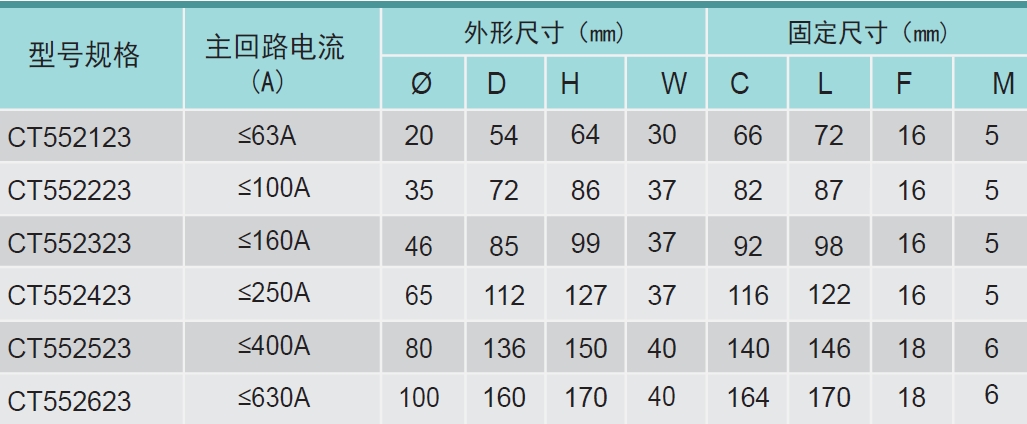 CT552系列尺寸對應圖表: